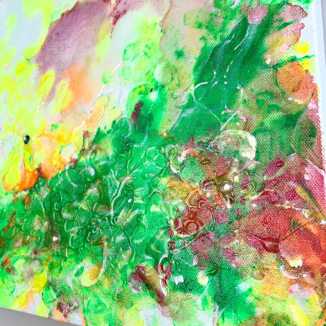 acrylic, gems, resin on stretched canvas
